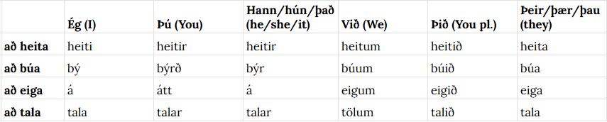 In the infinitive, most Icelandic verbs end in -a (for example: að vera, að heita). The verbs in Icelandic determine the case of the subsequent nouns, pronouns and adjectives of a sentence. For example: ég tala íslensku* (I speak Icelandic). The verb að tala requires that the noun íslenska (Icelandic) should take the accusative case. We’ll dive deeper into grammatical cases in later lessons.